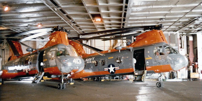 DevelopmentOriginsPiasecki Helicopter was a pioneering developer of tandem-rotor helicopters, with the most famous previous helicopter being the H-21 "Flying Banana". Piasecki Helicopter became Vertol in 1955 and work began on a new tandem rotor helicopter designated the Vertol Model 107 or V-107 in 1956. The V-107 prototype had two Lycoming T53 turboshaft engines, producing 877 shp (640 kW) each. The first flight of the V-107 took place on 22 April 1958. The V-107 was then put through a flight demonstration tour in the United States and overseas. In June 1958, the U.S. Army awarded a contract to Vertol for ten production aircraft designated "YHC-1A". The order was later decreased to three, so the U.S. Army could divert funds to the V-114, also a turbine powered tandem, but larger than the V-107. The Army's three YHC-1As were powered by GE-T-58 engines. The YHC-1As first flew in August 1959, and were followed by an improved commercial/export model, the 107-II. During 1960, the U.S. Marine Corps evolved a requirement for a twin-turbine troop/cargo assault helicopter to replace the piston engine types then in use. Following a design competition, Boeing Vertol was selected to build its model 107M as the HRB-1, early in 1961. Boeing had acquired Vertol in 1960 and renamed the group Boeing Vertol. In 1962 the U.S. Air Force ordered 12 XCH-46B Sea Knights with the XH-49A designation. but later cancelled the order due to a delay in the delivery schedule. They opted for the Sikorsky S-61R instead. The Sea Knight was first procured in 1961 by the U.S. Marine Corps to meet their medium-lift requirements.[7] Its first flight in August 1962 was followed by a change in designation to CH-46A. Fleet introduction of CH-46As with the Marines and the Navy's UH-46As was in November 1964. The UH-46A variant was modified for use in the vertical replenishment role. The CH-46A was equipped with a pair of T58-GE8-8B turboshaft engines rated at 1,250 shp (930 kW) each and could carry 17 passengers or 4,000 pounds (1,815 kg) of cargo. Further developmentsProduction of the improved CH-46D followed with deliveries beginning in 1966. Its improvements included modified rotor blades and more powerful T58-GE-10 turboshaft engines rated at 1,400 shp (1,040 kW) each. The increased power allowed the D-model to carry 25 troop or 7,000 pounds (3,180 kg) of cargo. The CH-46D was introduced to the Vietnam theater in late 1967, supplementing the U.S. Marine Corps' existing unreliable and problematic CH-46A fleet. Along with the USMC's CH-46Ds, the U.S. Navy received a small number of UH-46Ds for ship resupply. Also, approximately 33 CH-46As were upgraded to CH-46Ds. The Marines also received CH-46Fs from 1968 to 1971. The F-model retained the D-model's T58-GE-10 engines but revised the avionics and included other modifications. The CH-46F was the final production model. The Sea Knight has undergone upgrades and modifications. Most of the U.S. Marine Corps' Sea Knights were upgraded to CH-46E standard. The CH-46E features fiberglass rotor blades, airframe reinforcement, and further uprated T58-GE-16 engines producing 1,870 shp (1,390 kW) each. Some CH-46Es have been given doubled fuel capacity. The Dynamic Component Upgrade (DCU) incorporated starting in the mid-1990s provides for increased capabilities through strengthened drive systems and rotor controls. The commercial variant, the BV 107-II, was first ordered by New York Airways in 1960. They took delivery of their first three aircraft, configured for 25 passengers, in July 1962. In 1965, Boeing Vertol sold the manufacturing rights of the 107 to Kawasaki Heavy Industries. Under this arrangement, all Model 107 civilian and military aircraft built in Japan are known as KV 107. On 15 December 2006, Columbia Helicopters, Inc acquired the type certificate for the Boeing Vertol 107-II, and is in the process of acquiring a Production Certificate from the FAA. Plans for actual production of the aircraft have not been announced. DesignThe CH-46 has tandem contrarotating rotors powered by two GE T58 turboshaft engines. The engines are mounted on each side of the rear rotor pedestal with a driveshaft to the forward rotor. The engines are coupled so either could power both rotors in an emergency. The rotors feature three blades and can be folded for on-ship operations. The CH-46 has fixed tricycle landing gear, with twin wheels on all three units. The gear configuration causes a nose-up stance to facilitate cargo loading and unloading. The main gear are fitted in rear sponsons that also contain fuel tanks with a total capacity of 350 US gallons (1,438 L). The CH-46 has a cargo bay with a rear loading ramp that could be removed or left open in flight for extended cargo or for parachute drops. An internal winch is mounted in the forward cabin and can be used to pull external cargo on pallets into the aircraft via the ramp and rollers. A belly sling hook (cargo hook) which is usually rated at 10,000 lb (4,500 kg). could be attached for carrying external cargo. Although the hook is rated at 10,000 lb (4,500 kg)., the limited power produced by the engines preclude the lifting of such weight. It usually has a crew of three, but can accommodate a larger crew depending on mission specifics. For example, a Search and Rescue variant will usually carry a crew of five (Pilot, Co-Pilot, Crew Chief, Swimmer, and Medic) to facilitate all aspects of such a mission. A pintle-mounted 0.50 in (12.7 mm) Browning machine gun is mounted on each side of the helicopter for self-defense. Service in southeast Asia resulted in the addition of armor with the guns. Operational historyUnited StatesKnown colloquially as the "Phrog", the Sea Knight has been used in all U.S. Marine combat and peacetime environments since its introduction. As of 2011, it is still regularly flown by the U.S. Marine Corps, its longevity as a reliable airframe has led to such mantras as "phrogs phorever" and "never trust a helicopter unde