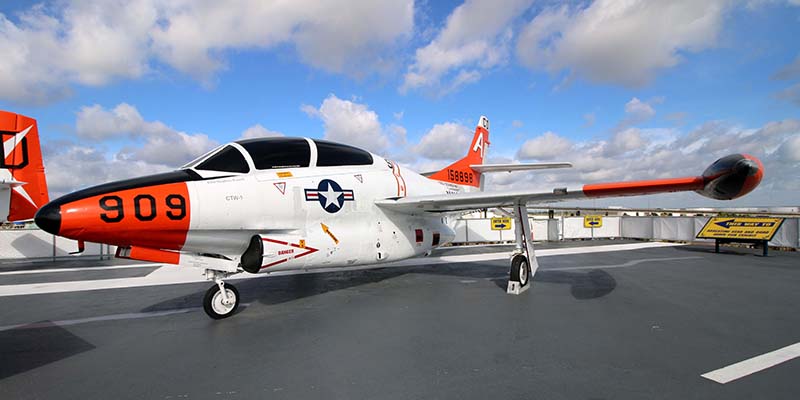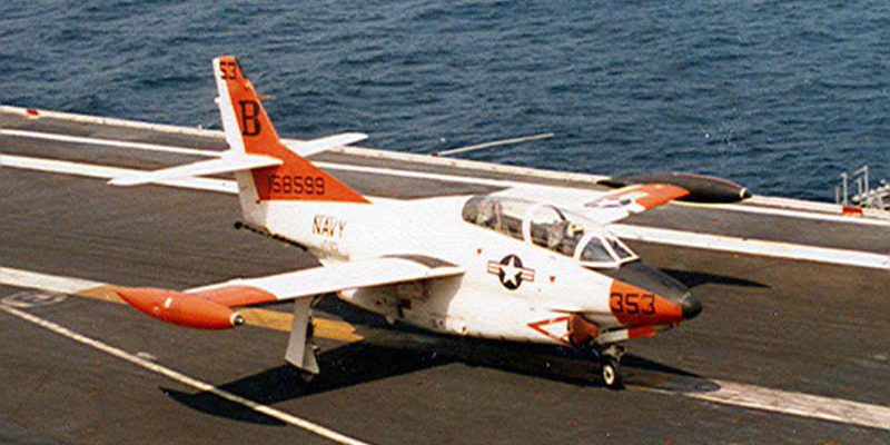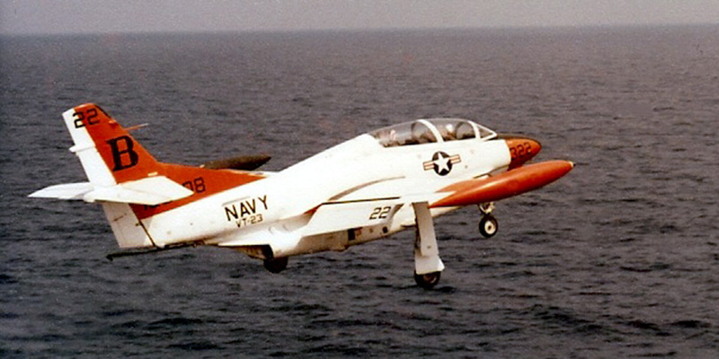 After the introduction of jet aircraft into Naval Aviation, the platforms first employed in the training of jet pilots were types retired from front-line service in the fleet and training versions of fleet aircraft, among them the F9F-8T Cougar and TV Shooting Star. In 1956, Rockwell International Corporation began design work to meet the Navy's requirement for an all-purpose jet trainer for intermediate and advanced training. The result was the T-2 Buckeye, a tandem-cockpit aircraft that drew from proven, existing technologies, its wings derived from the FJ-1 Fury and its control system in line with that of the propeller-driven T-28 Trojan training aircraft. As a multipurpose jet training, the T-2 incorporated under-wing hard points for weapons training and arresting gear for carrier qualification. The final carrier qualification flights made by T-2s occurred in 2003, and the aircraft has been replaced in the Naval Air Training Command by the T-45 Goshawk. |